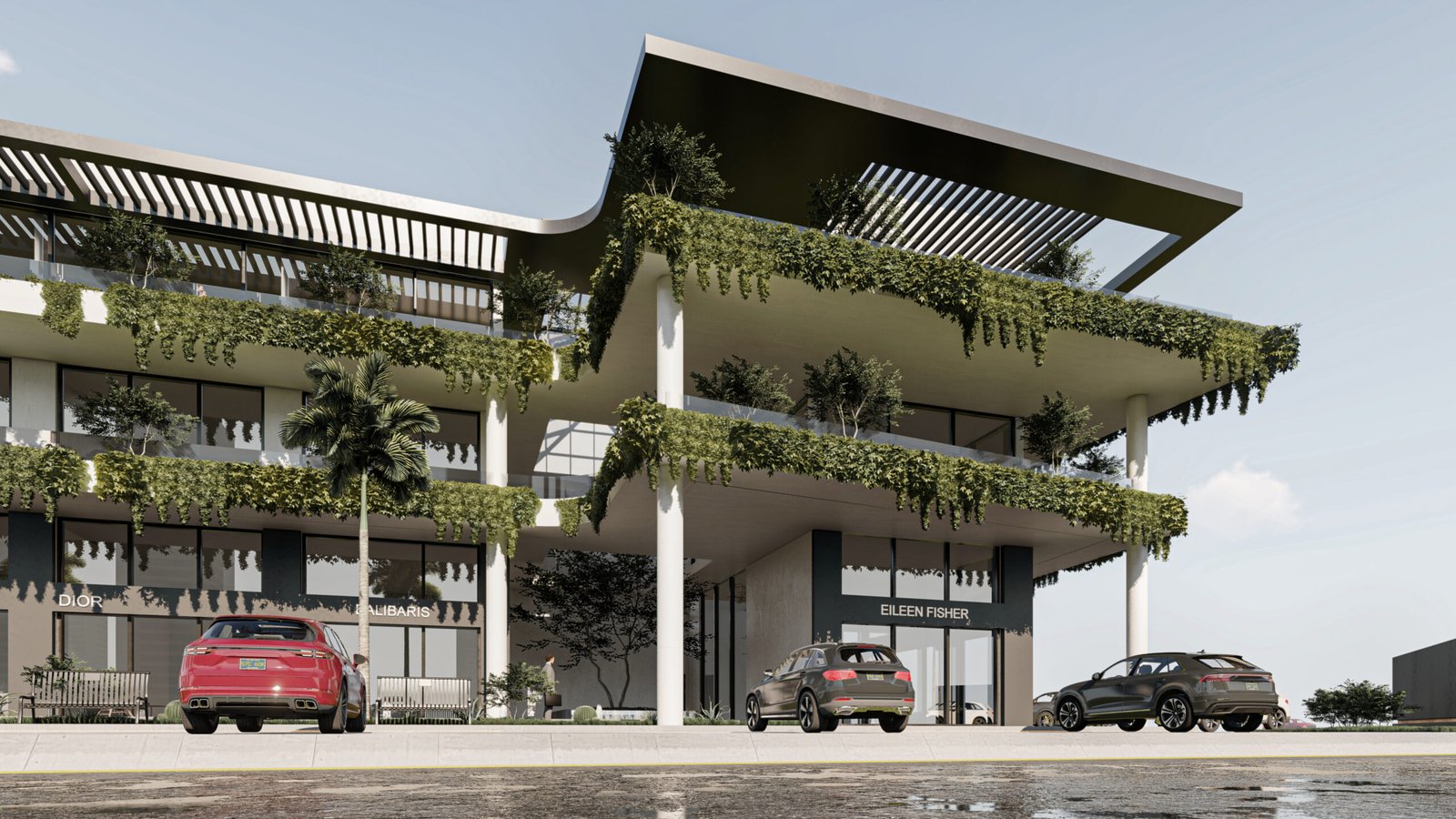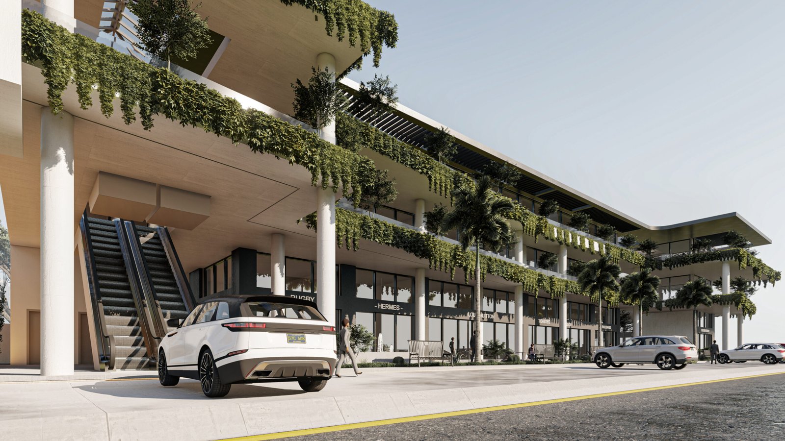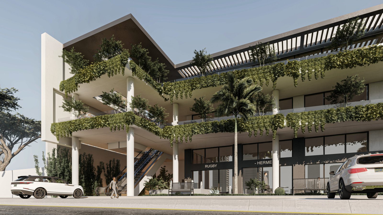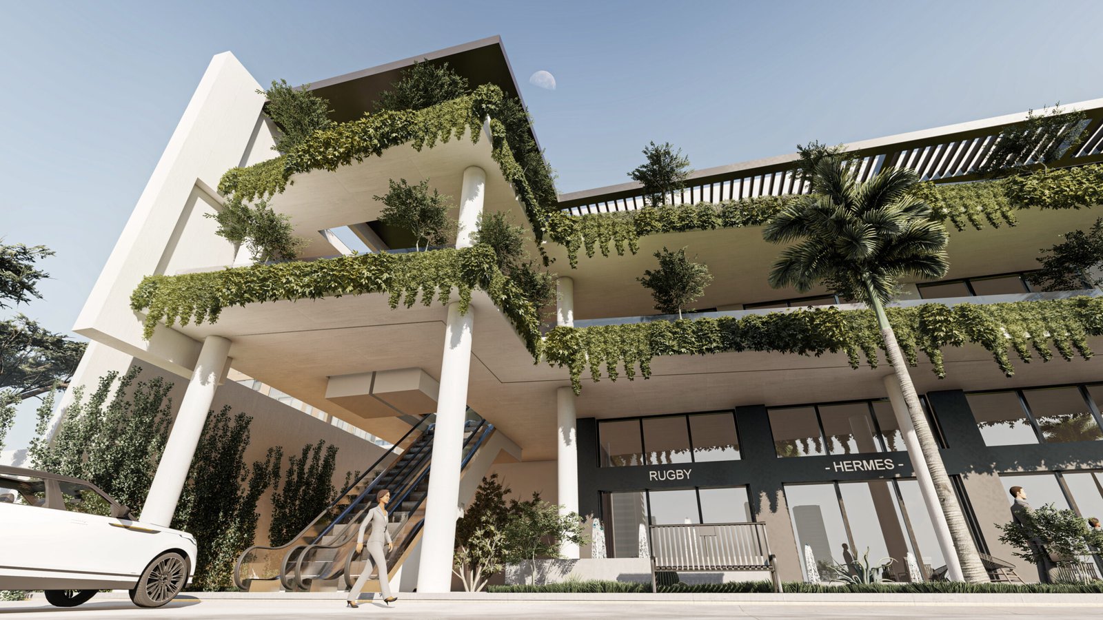 يعتمد المجمع على تحويل المباني التجارية من كتل صلبة إلى بيئات حية ومستدامة. تلعب النباتات المتدلية من كافة الطوابق دوراً حيوياً في تقليل البصمة الحرارية للمبنى، بينما توفر الواجهات الزجاجية الشفافة في الطابق الأرضي تواصلاً بصرياً جذاباً للمعارض والمتاجر.