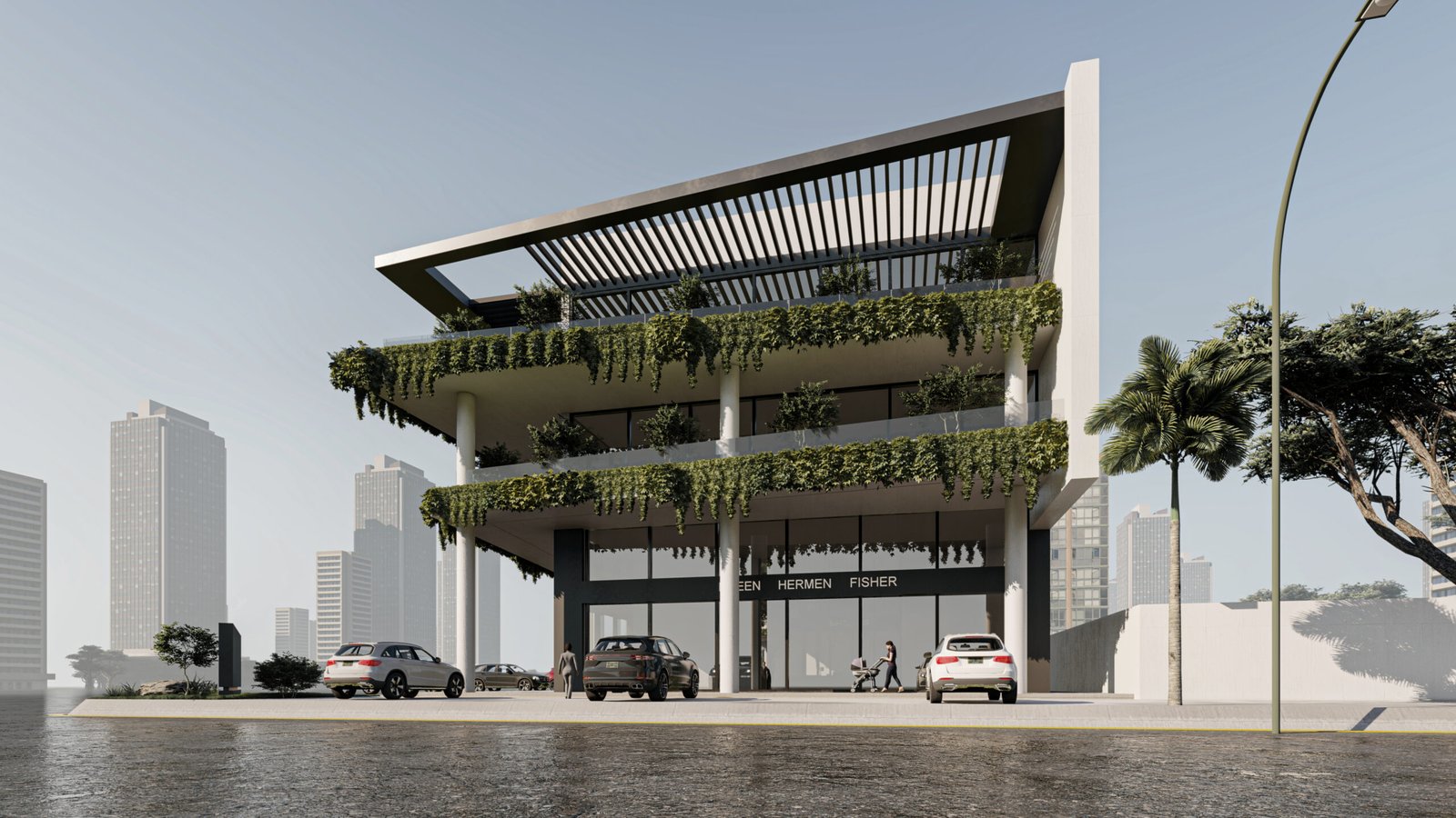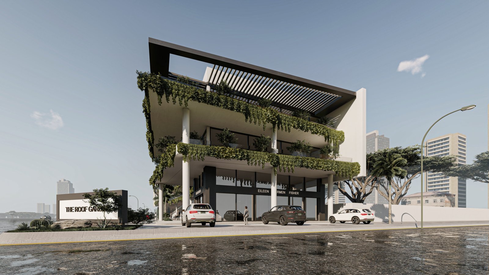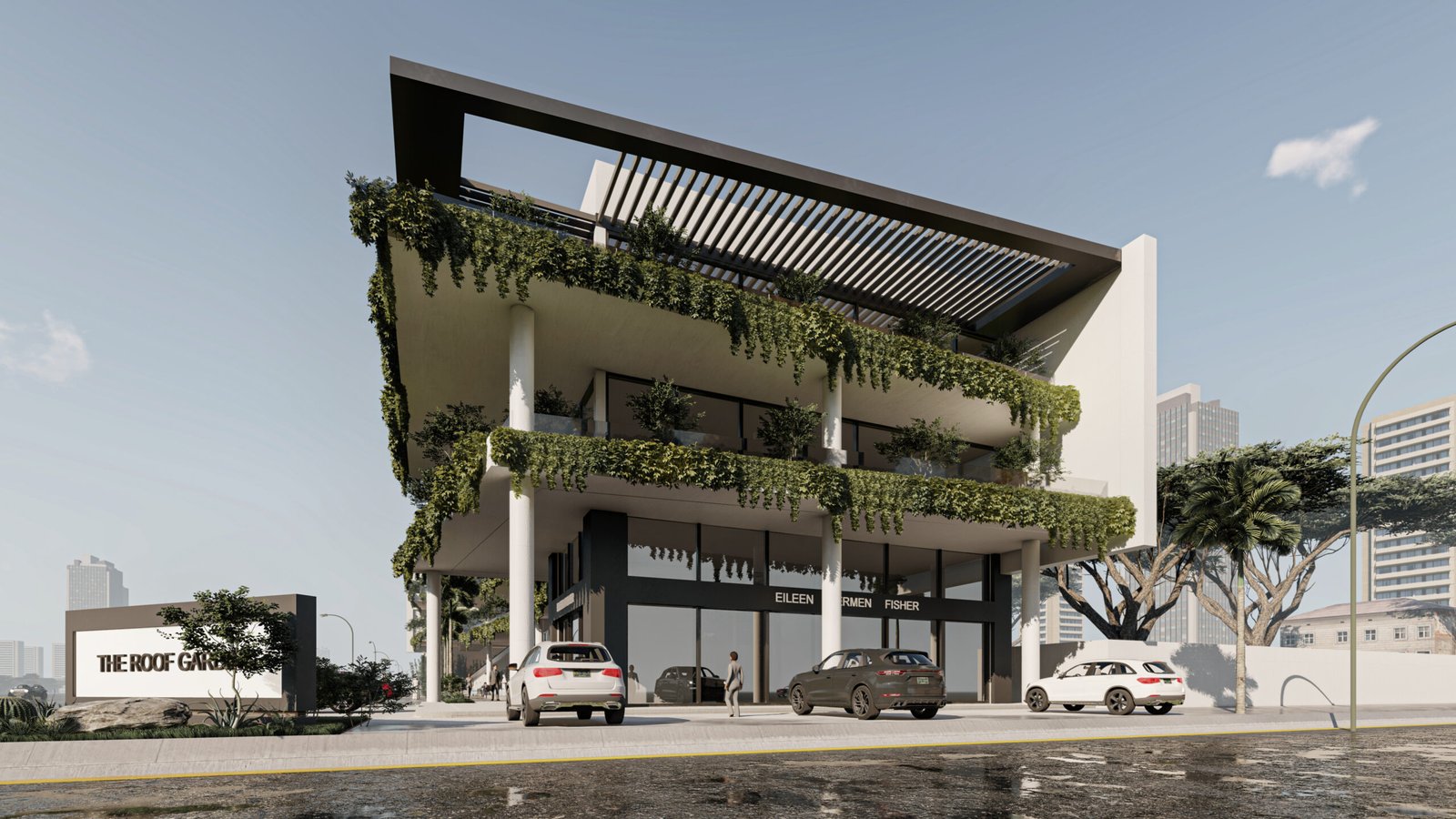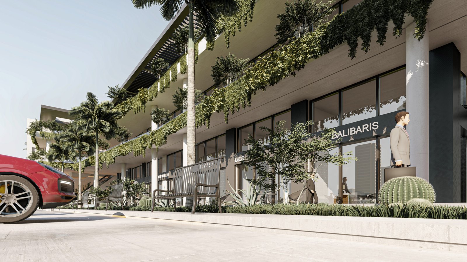 يعتمد المجمع على تحويل المباني التجارية من كتل صلبة إلى بيئات حية ومستدامة. تلعب النباتات المتدلية من كافة الطوابق دوراً حيوياً في تقليل البصمة الحرارية للمبنى، بينما توفر الواجهات الزجاجية الشفافة في الطابق الأرضي تواصلاً بصرياً جذاباً للمعارض والمتاجر.