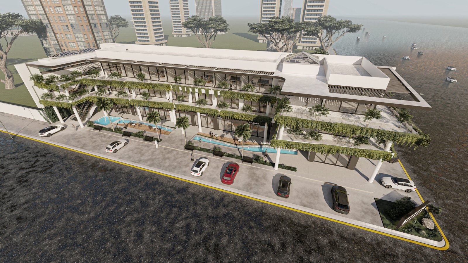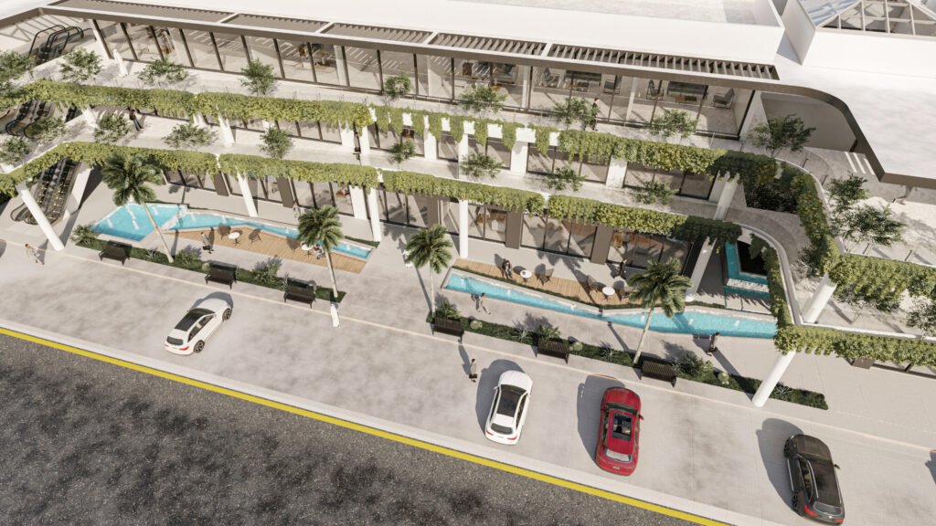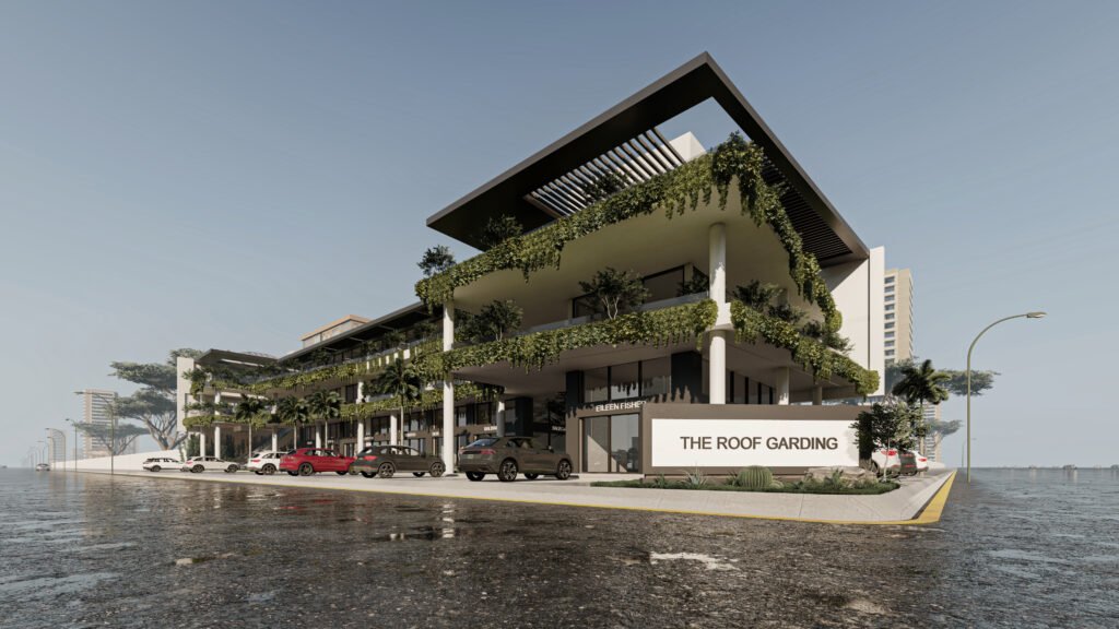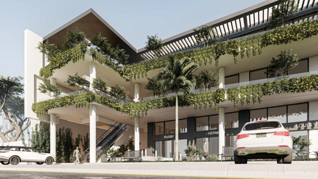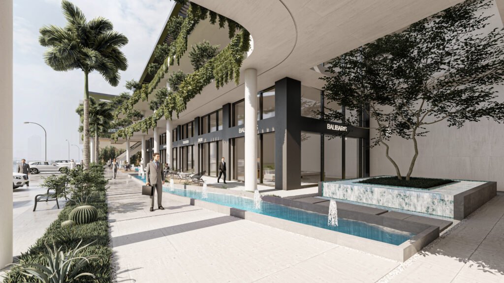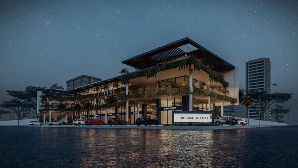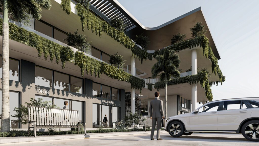 يمثل هذا المشروع نقلة نوعية في تصميم المجمعات التجارية ومتعددة الاستخدامات، حيث يتبنى نهج 'العمارة البيوفيلية' (Biophilic Design) لدمج الطبيعة في صميم التجربة العمرانية. يتميز المبنى بشرفات ممتدة تلتف حول الكتل المعمارية وتتزين بنباتات متدلية (Cascading Greenery) تكسر حدة الخطوط الخرسانية والزجاجية، وتعمل كمصدات بيئية تلطف الأجواء. يلتف هذا المجمع حول بلازا (فناء مركزي) مفتوحة تضم مسطحات مائية وممرات للمشاة، مما يوفر بيئة مثالية تجمع بين حيوية الأعمال التجارية وهدوء الطبيعة الساحرة.