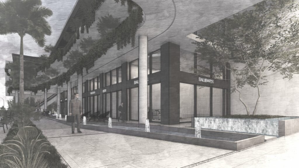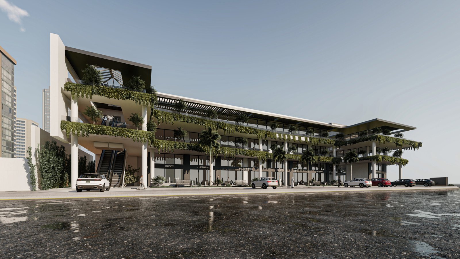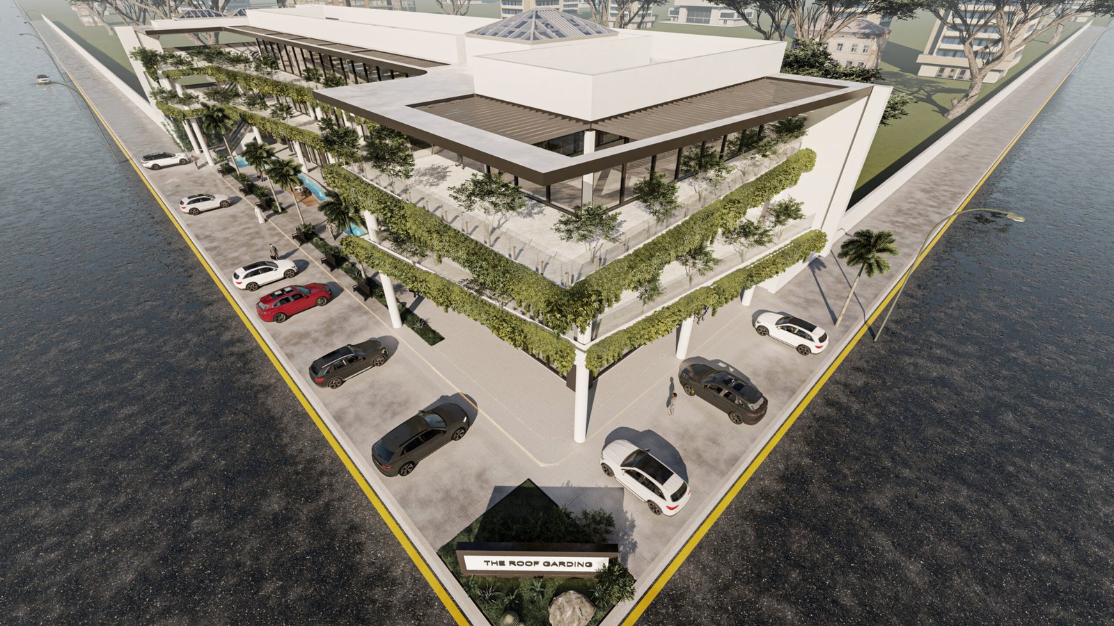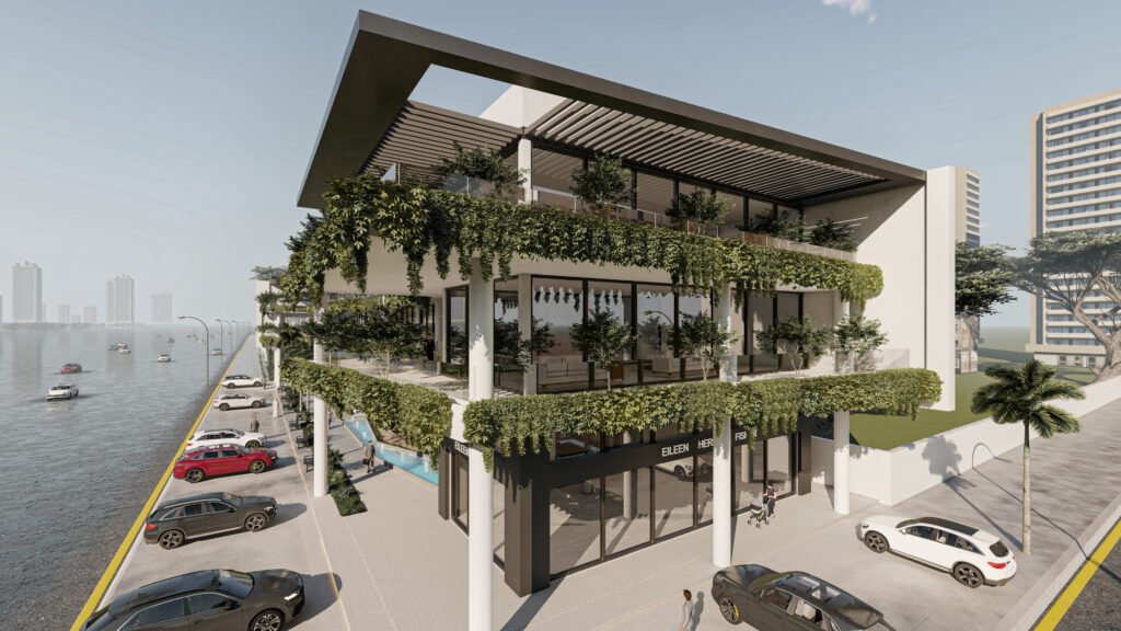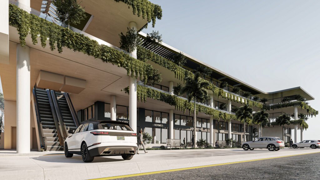يمثل هذا المشروع نقلة نوعية في تصميم المجمعات التجارية ومتعددة الاستخدامات، حيث يتبنى نهج 'العمارة البيوفيلية' (Biophilic Design) لدمج الطبيعة في صميم التجربة العمرانية. يتميز المبنى بشرفات ممتدة تلتف حول الكتل المعمارية وتتزين بنباتات متدلية (Cascading Greenery) تكسر حدة الخطوط الخرسانية والزجاجية، وتعمل كمصدات بيئية تلطف الأجواء. يلتف هذا المجمع حول بلازا (فناء مركزي) مفتوحة تضم مسطحات مائية وممرات للمشاة، مما يوفر بيئة مثالية تجمع بين حيوية الأعمال التجارية وهدوء الطبيعة الساحرة.
