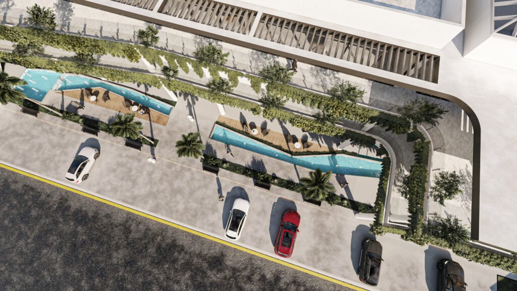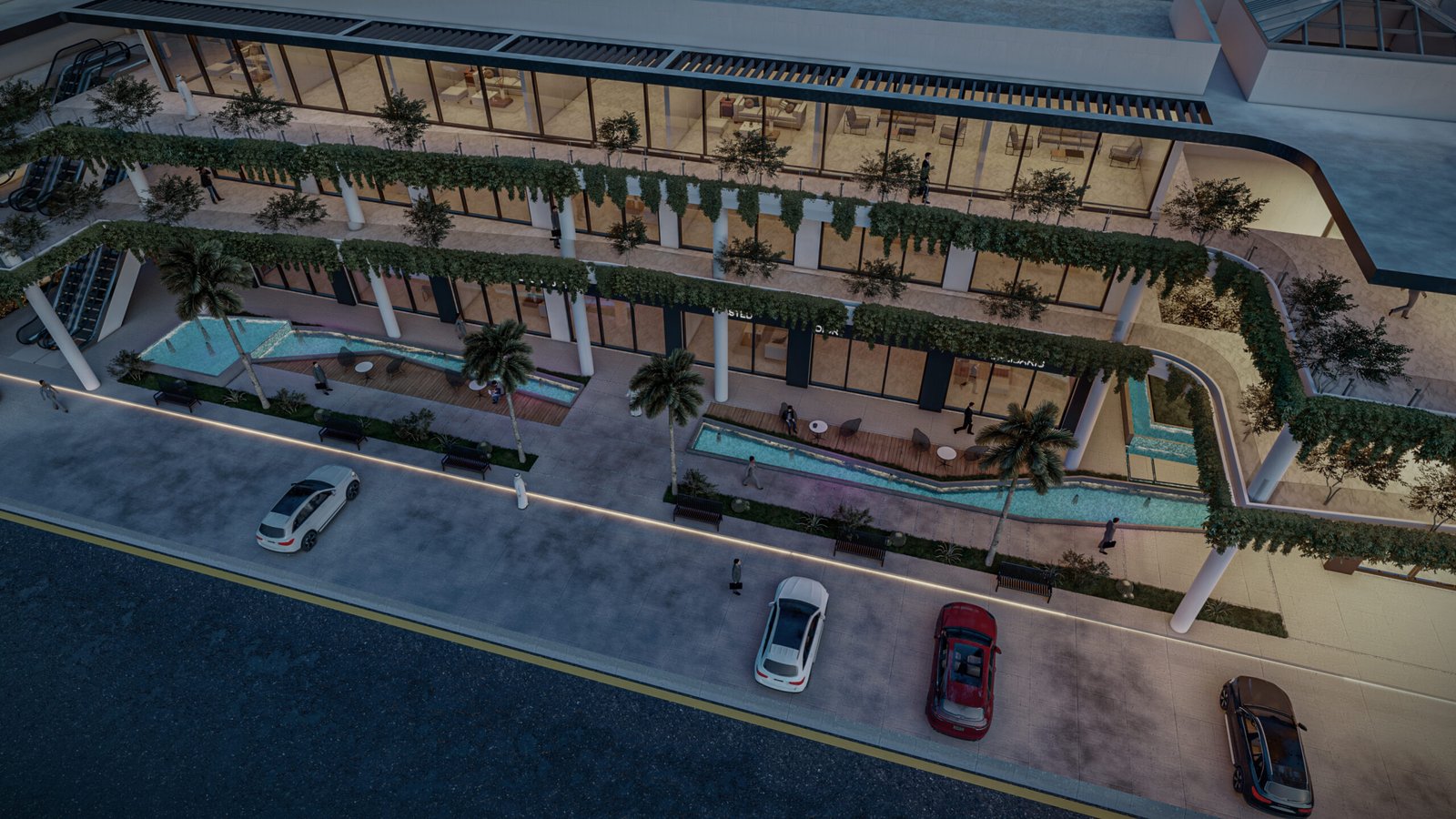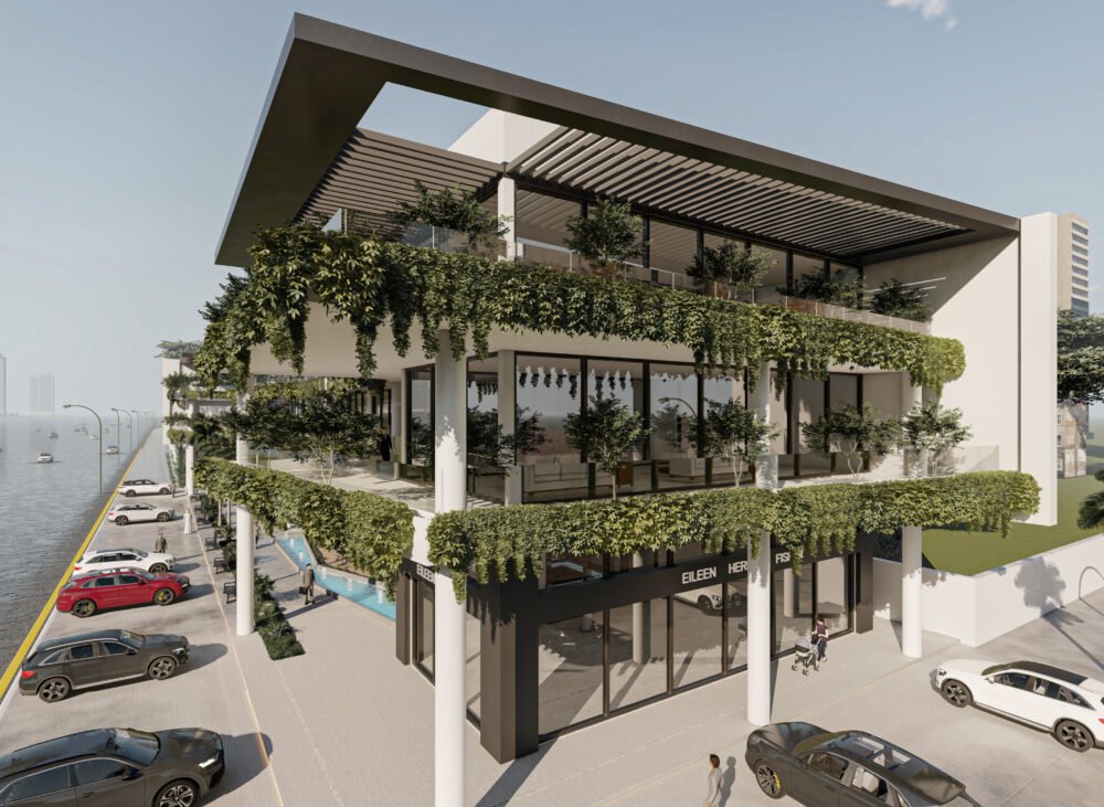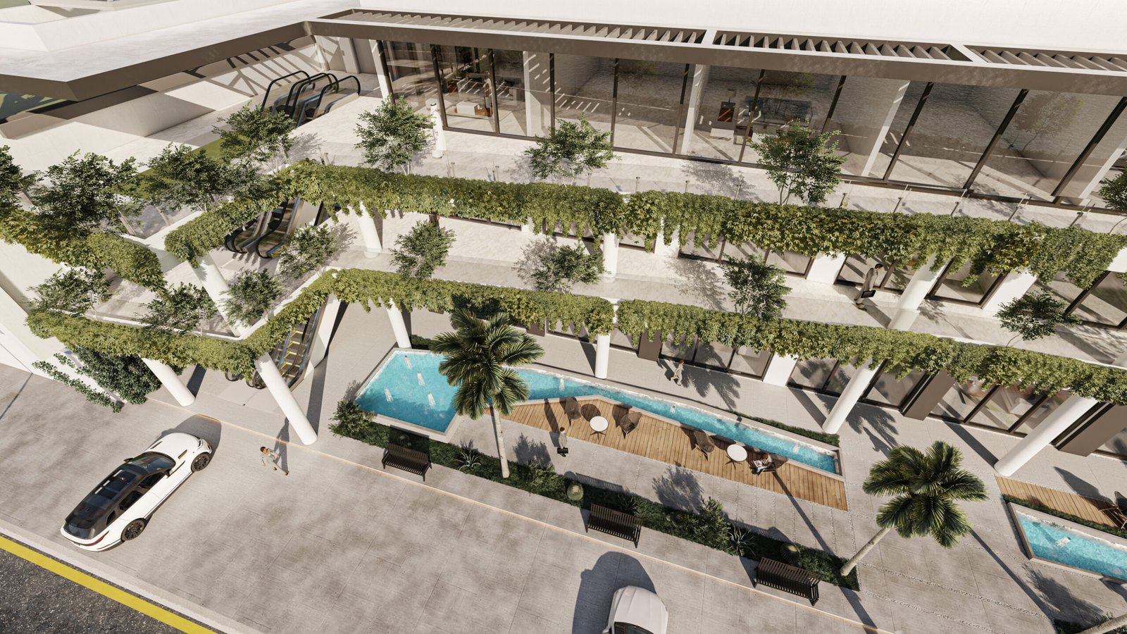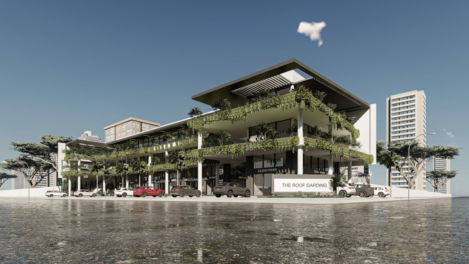 يمثل هذا المشروع نقلة نوعية في تصميم المجمعات التجارية ومتعددة الاستخدامات، حيث يتبنى نهج 'العمارة البيوفيلية' (Biophilic Design) لدمج الطبيعة في صميم التجربة العمرانية. يتميز المبنى بشرفات ممتدة تلتف حول الكتل المعمارية وتتزين بنباتات متدلية (Cascading Greenery) تكسر حدة الخطوط الخرسانية والزجاجية، وتعمل كمصدات بيئية تلطف الأجواء. يلتف هذا المجمع حول بلازا (فناء مركزي) مفتوحة تضم مسطحات مائية وممرات للمشاة، مما يوفر بيئة مثالية تجمع بين حيوية الأعمال التجارية وهدوء الطبيعة الساحرة.