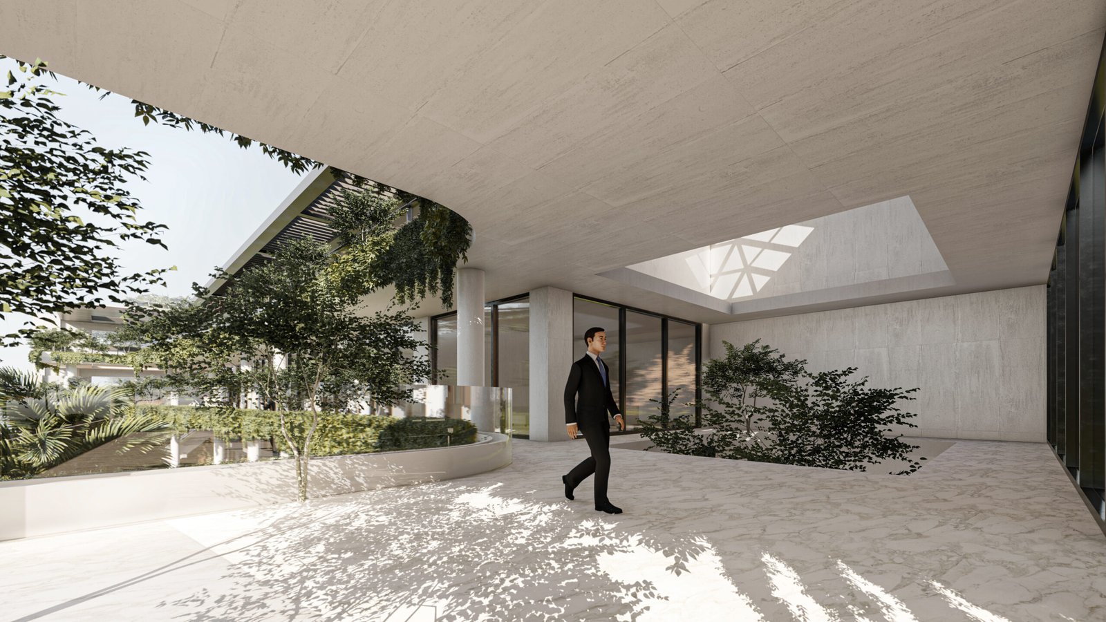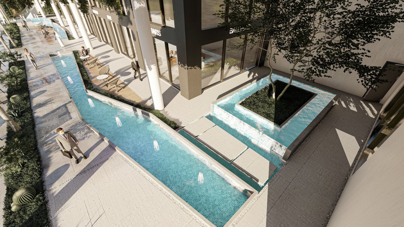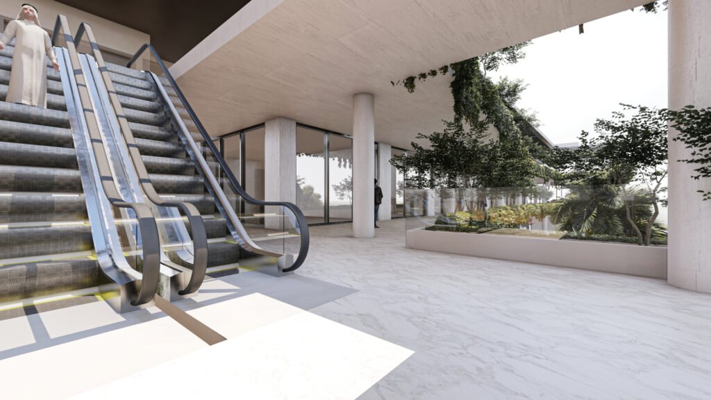 • البلازا المركزية (Central Plaza): فناء داخلي رحب يضم مسابح أو مسطحات مائية عاكسة، يوفر مساحات جلوس مفتوحة للزوار والموظفين بعيداً عن صخب الشارع.