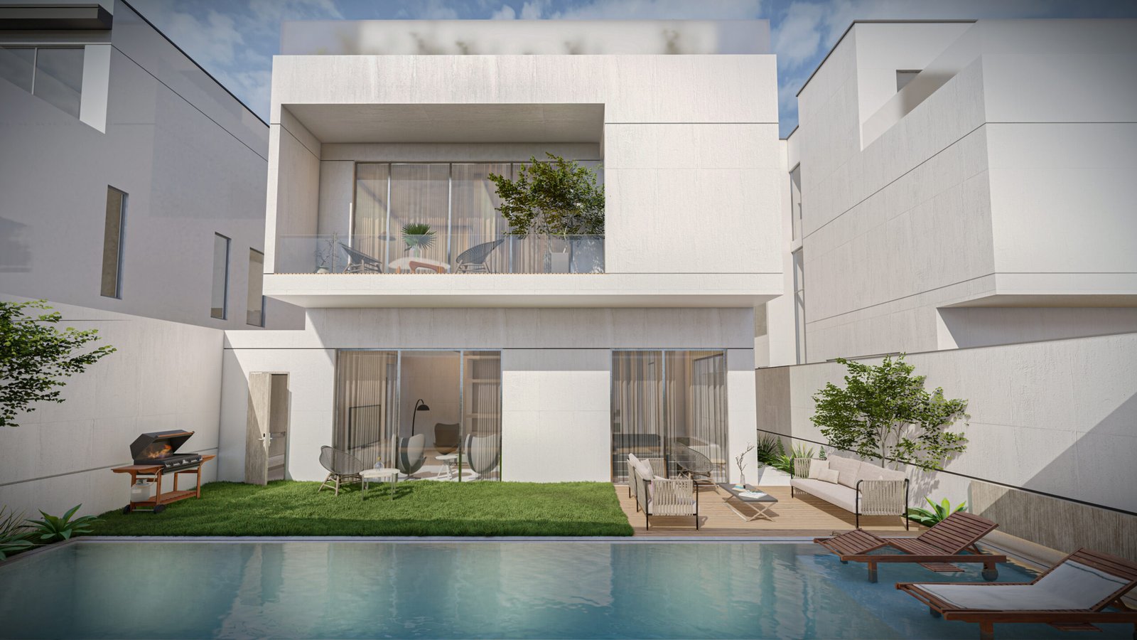 • البروزات المعمارية (Overhangs): أسقف ممتدة بجرأة لتوفير الظل الذاتي للواجهات وحماية النوافذ من أشعة الشمس المباشرة.