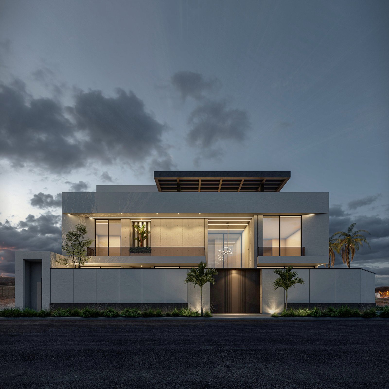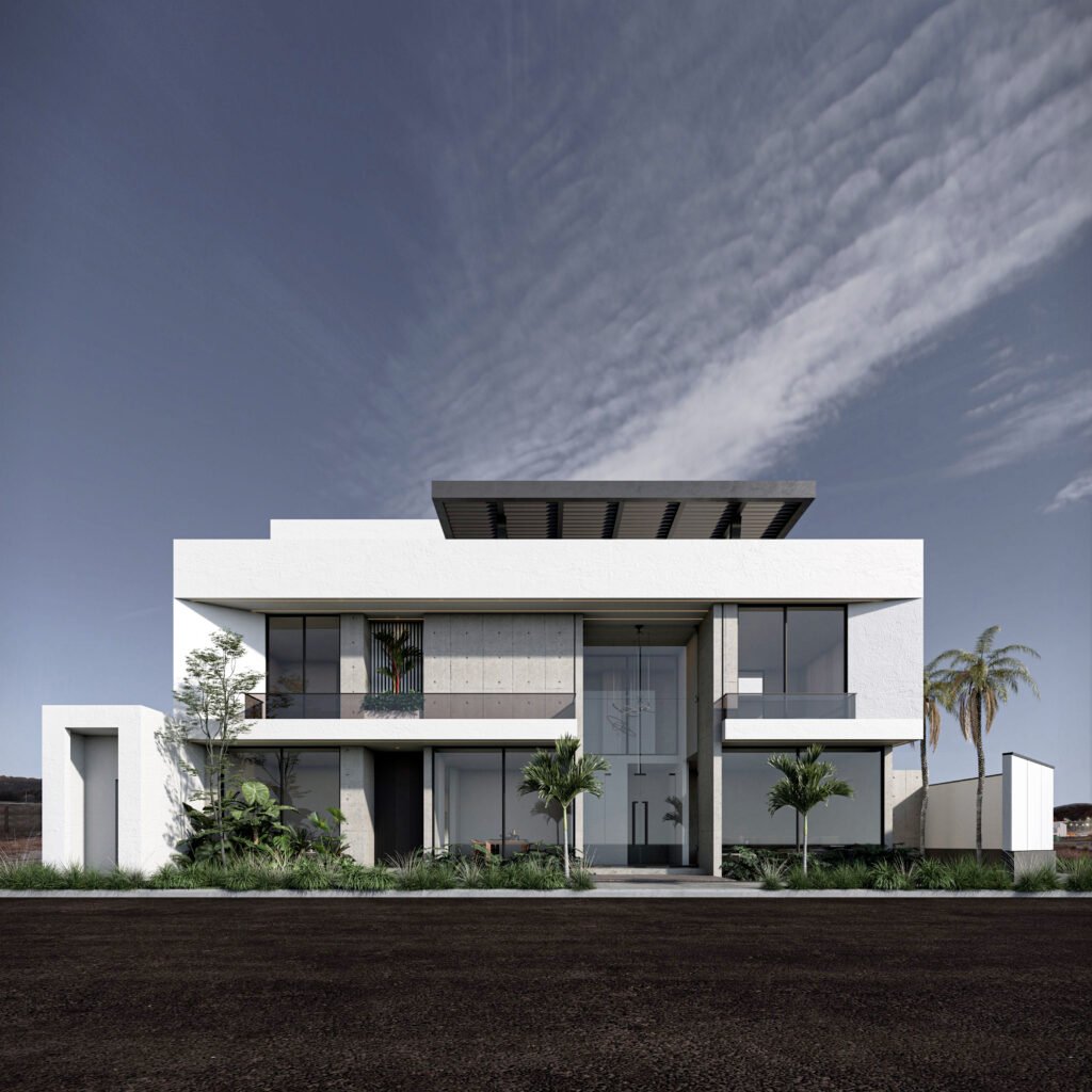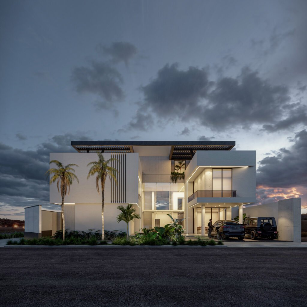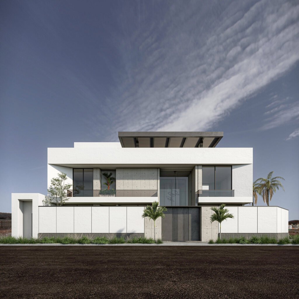 يُجسد هذا المشروع مفهوم 'الامتداد الأفقي' في العمارة الحديثة، مما يمنح الفيلا حضوراً مهيباً وواجهة عريضة تعكس أقصى درجات الفخامة والرحابة. يعتمد التصميم على الأسقف البارزة والممتدة (Cantilevered Canopies) التي تعمل كمظلات طبيعية للواجهات الزجاجية الواسعة، مما يقلل من الاكتساب الحراري مع الحفاظ على الإطلالات البانورامية. التباين المدروس بين الكتل البيضاء النقية والتشطيبات الداكنة يضفي عمقاً بصرياً فريداً، ويتعزز هذا الجمال ليلاً من خلال نظام إضاءة معمارية يبرز أناقة الخطوط الهندسية.