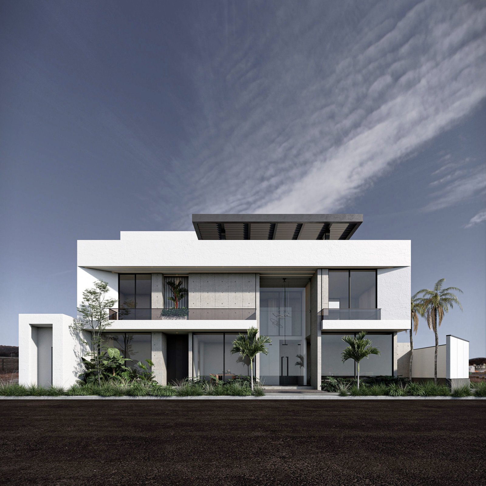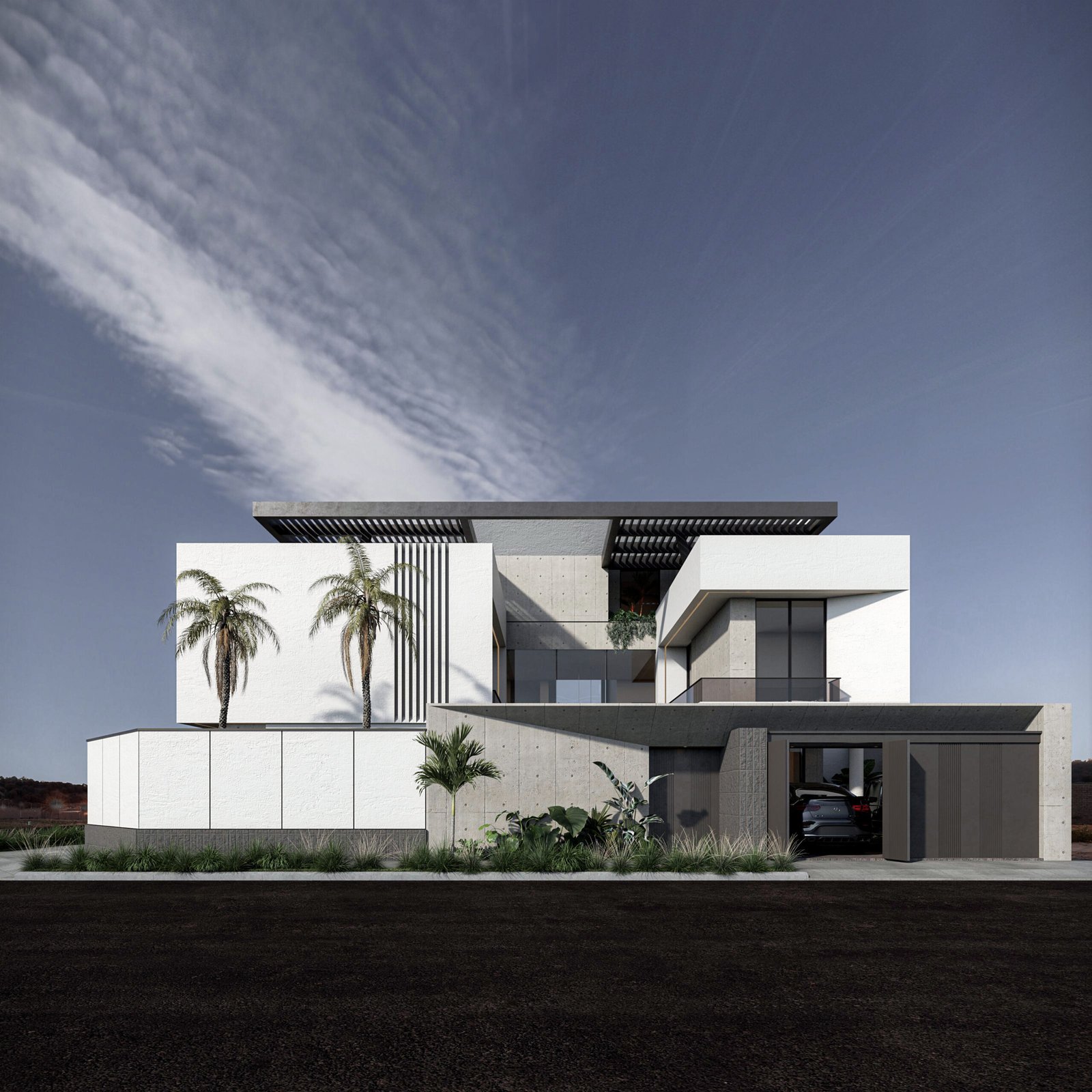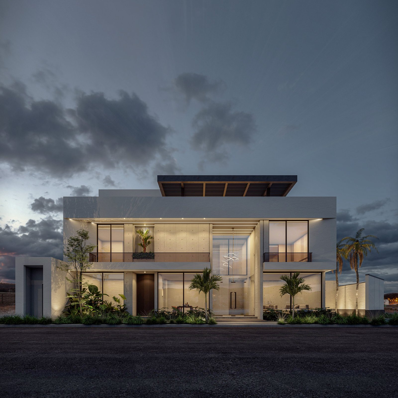 يُجسد هذا المشروع مفهوم 'الامتداد الأفقي' في العمارة الحديثة، مما يمنح الفيلا حضوراً مهيباً وواجهة عريضة تعكس أقصى درجات الفخامة والرحابة. يعتمد التصميم على الأسقف البارزة والممتدة (Cantilevered Canopies) التي تعمل كمظلات طبيعية للواجهات الزجاجية الواسعة، مما يقلل من الاكتساب الحراري مع الحفاظ على الإطلالات البانورامية. التباين المدروس بين الكتل البيضاء النقية والتشطيبات الداكنة يضفي عمقاً بصرياً فريداً، ويتعزز هذا الجمال ليلاً من خلال نظام إضاءة معمارية يبرز أناقة الخطوط الهندسية.