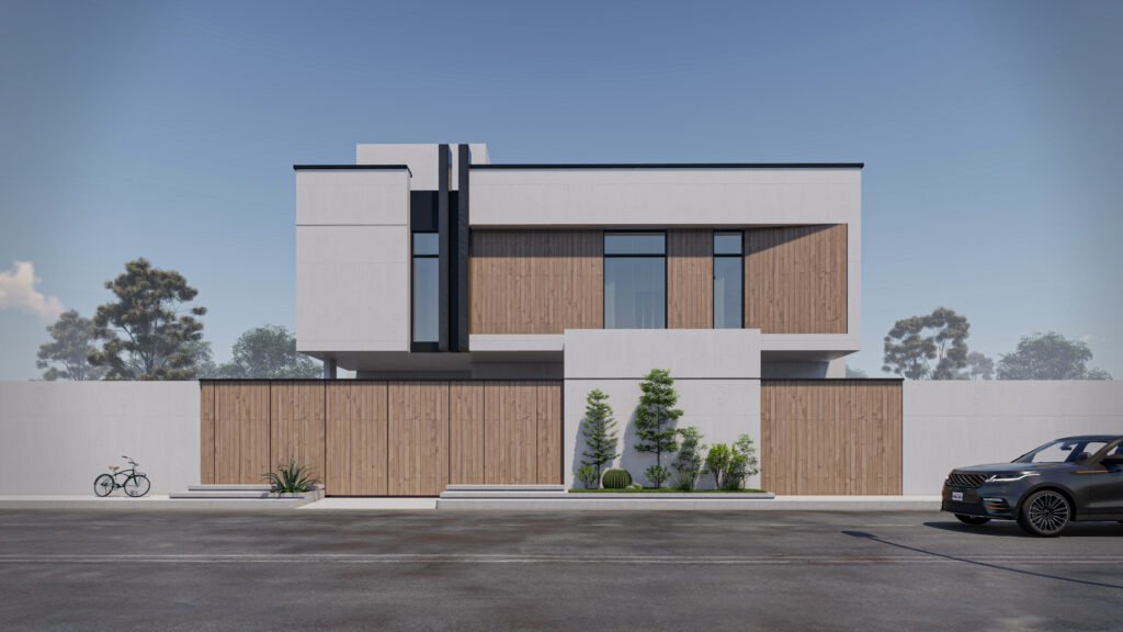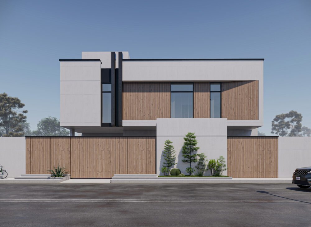 يُجسد هذا المشروع التناغم المثالي بين الخطوط الهندسية الصارمة ودفء المواد الطبيعية. تعتمد واجهة الفيلا على تباين بصري جذاب يجمع بين الكتل البيضاء النقية، والعناصر الرأسية الداكنة التي تبرز شموخ المبنى، والتكسيات الخشبية الأنيقة التي توفر الخصوصية للغرف العلوية. داخلياً، يكشف المخطط الأفقي عن تصميم ذكي يلتف حول فناء داخلي ومسبح خاص، مما يضمن تدفق الإضاءة الطبيعية لجميع الفراغات المعيشية مع الحفاظ على أقصى درجات الخصوصية للعائلة.
