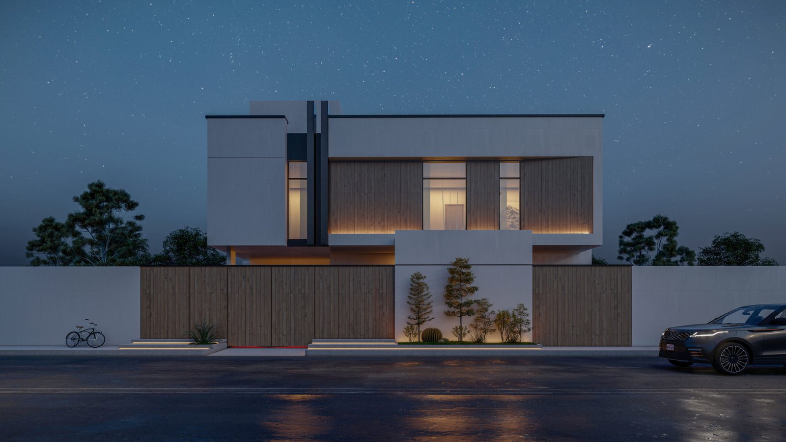 | الإضاءة الخارجية | إضاءة خطية دافئة (Linear LED) لإبراز التفاصيل المعمارية ليلاً |