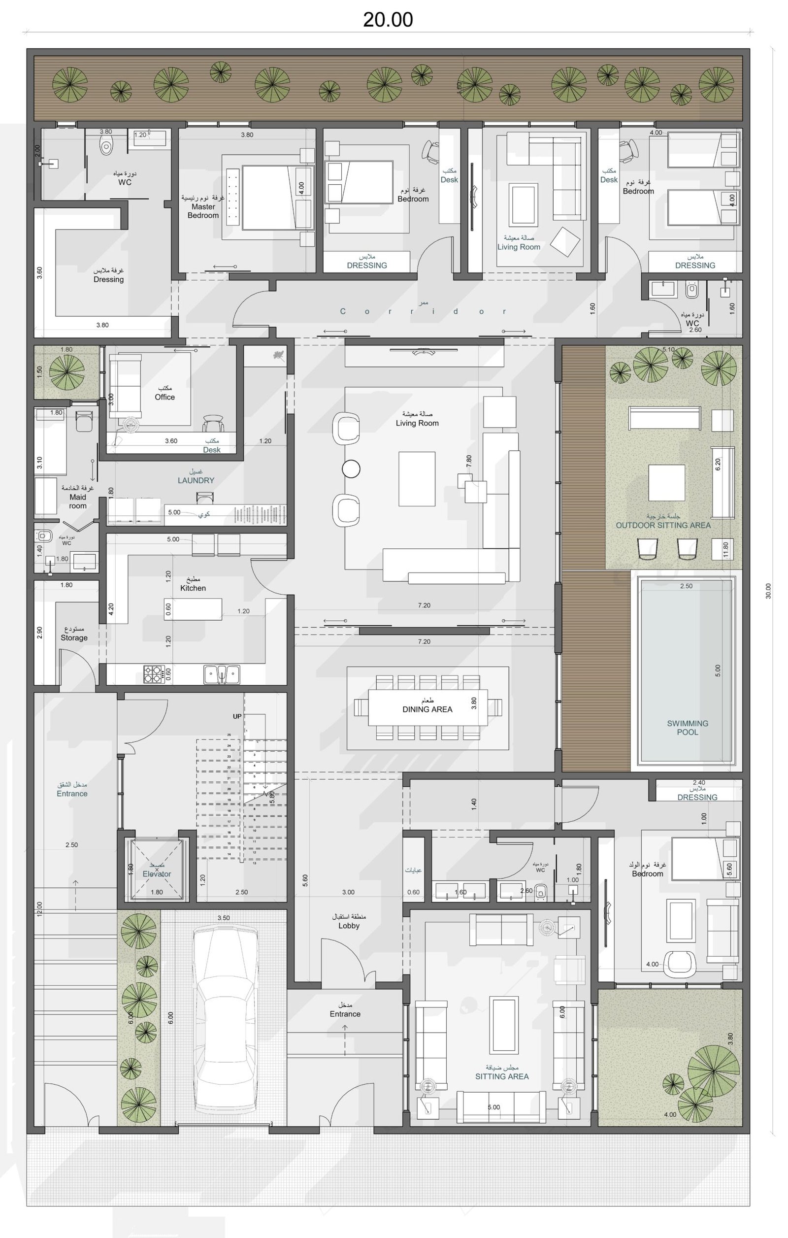 | العنصر المائي | مسبح طولي مدمج ضمن الفناء الداخلي للمخطط |