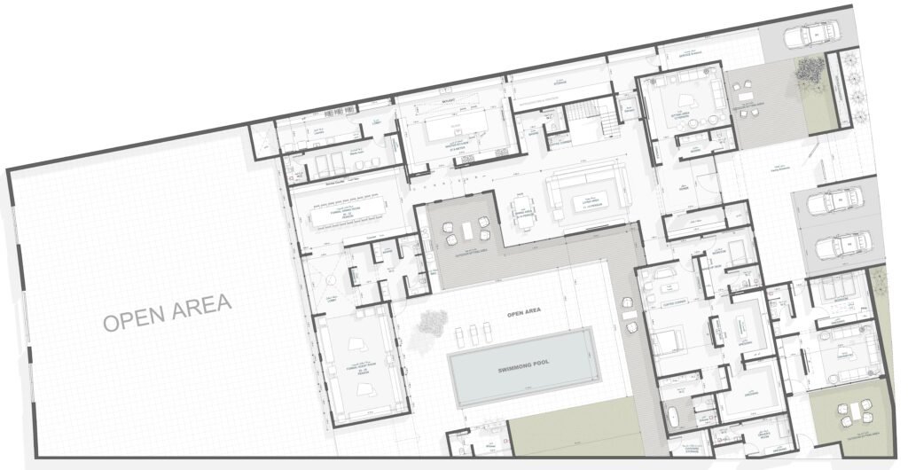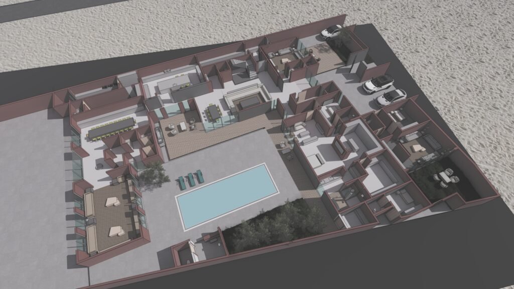 • الفناء والمسبح (Courtyard & Pool): يعمل الفناء الداخلي كمنظم حراري ومصدر رئيسي للإضاءة الطبيعية، حيث تلتف حوله الغرف لضمان إطلالة مائية هادئة.