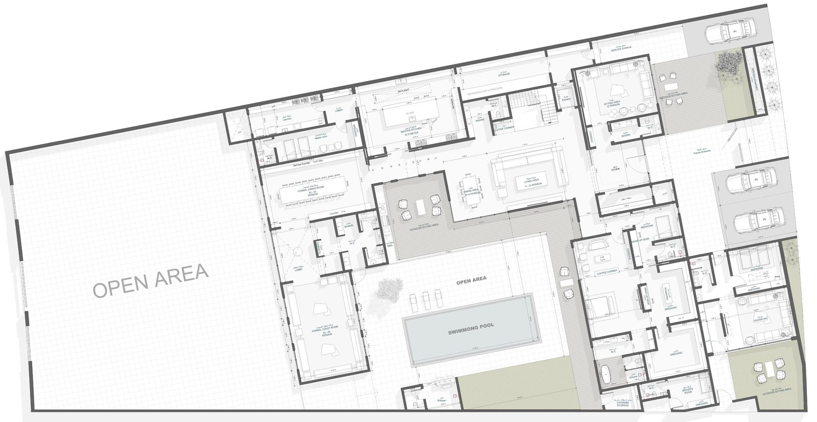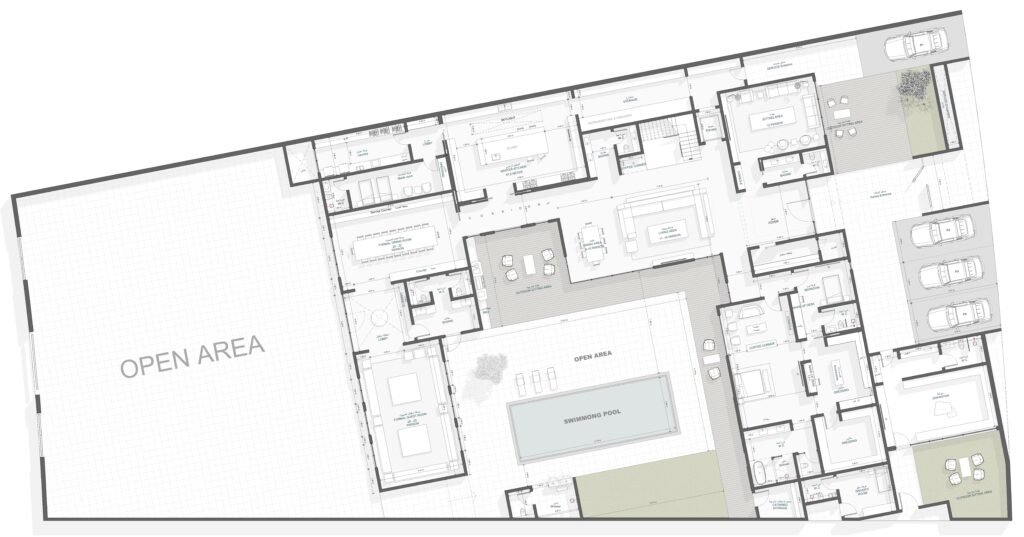 يسلط هذا المشروع الضوء على التحليل المكاني الدقيق والعلاقات الرأسية للفراغات من خلال المقاطع الهندسية (Sections) والمساقط الأفقية. يعتمد التصميم على فكرة 'الفناء الداخلي' (Courtyard) الذي يضم مسبحاً خاصاً، ليكون هذا الفناء هو القلب النابض للمنزل ومحور الحركة البصرية. تبرز القطاعات الرأسية كيفية ترابط الأدوار المختلفة وحركة السلالم حول هذا الفناء، مما يضمن تدفق الإضاءة الطبيعية والتهوية المثالية لكافة أرجاء الفيلا، مع توفير خصوصية تامة تلبي متطلبات العائلة.