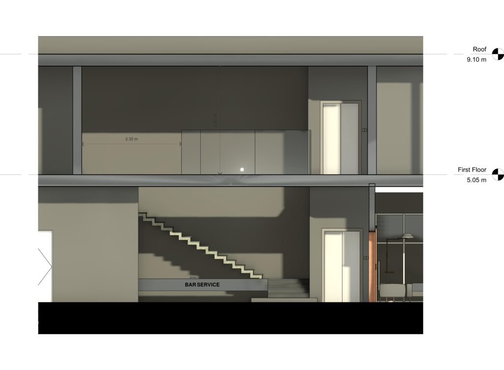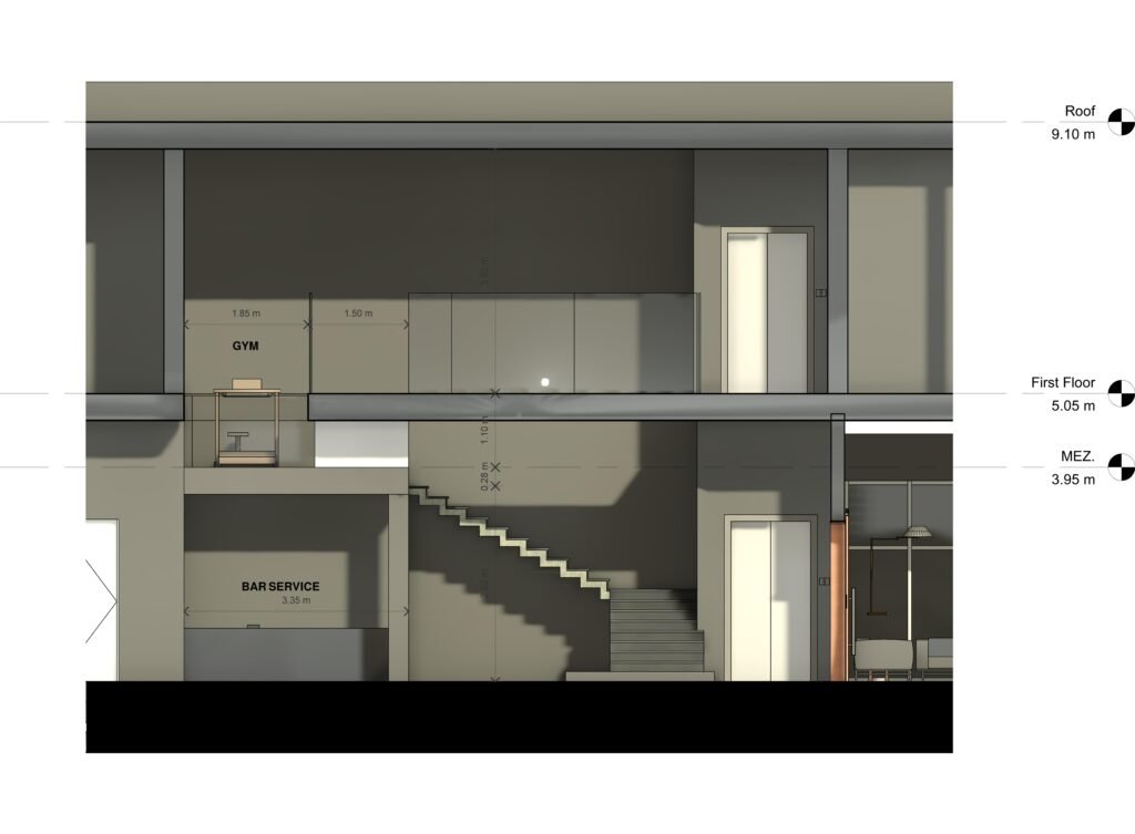 • القطاعات الرأسية (Sections): توضح القطاعات المعمارية الارتفاعات الصافية للأدوار، وعلاقة السلم الداخلي المفتوح بمسارات الحركة، مما يعطي تصويراً دقيقاً لحجم الفراغ (Volume).