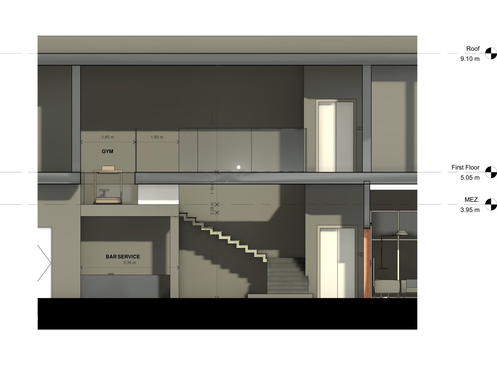 - القطاعات الرأسية (Sections): توضح القطاعات المعمارية الارتفاعات الصافية للأدوار، وعلاقة السلم الداخلي المفتوح بمسارات الحركة، مما يعطي تصويراً دقيقاً لحجم الفراغ (Volume).
