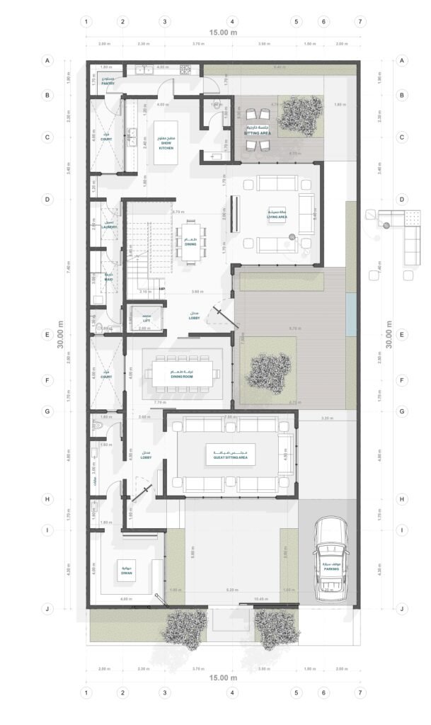 - الكفاءة المكانية: تصميم مخصص للأراضي الطولية، مع دمج مساحات تخزين ذكية ومناطق خدمات غير مرئية للضيوف.