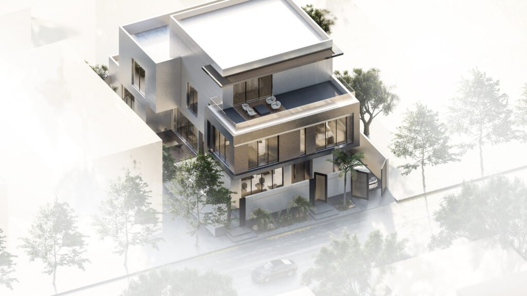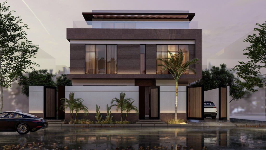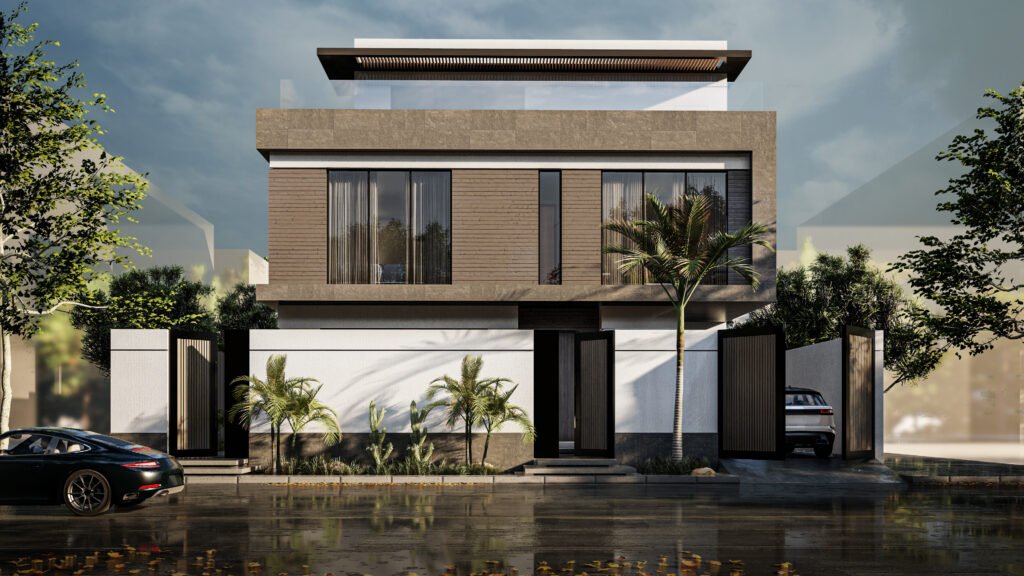 - واجهات متباينة: دمج جمالي متقن بين الطلاء الأبيض النقي في الدور الأرضي والتكسيات الخشبية الدافئة في الدور العلوي.