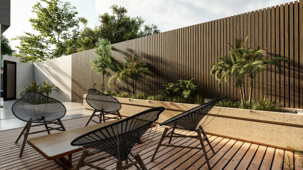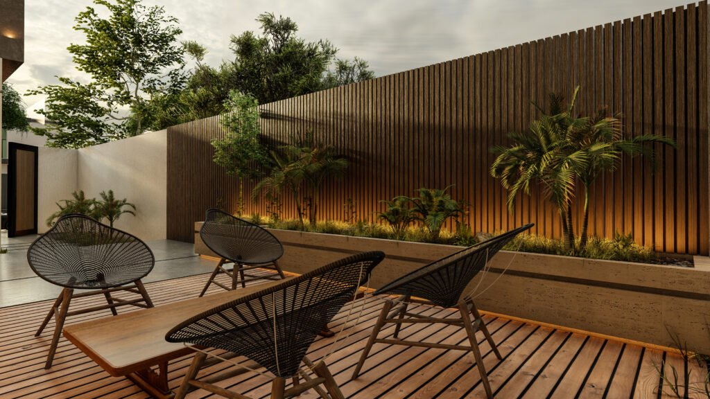 - الأسوار والخصوصية: تصميم سور خارجي من الشرائح الخشبية الطولية التي تسمح بالتهوية وتعطي مظهراً عصرياً جذاباً مع إضاءة ليلية سفلية (Uplighting).
