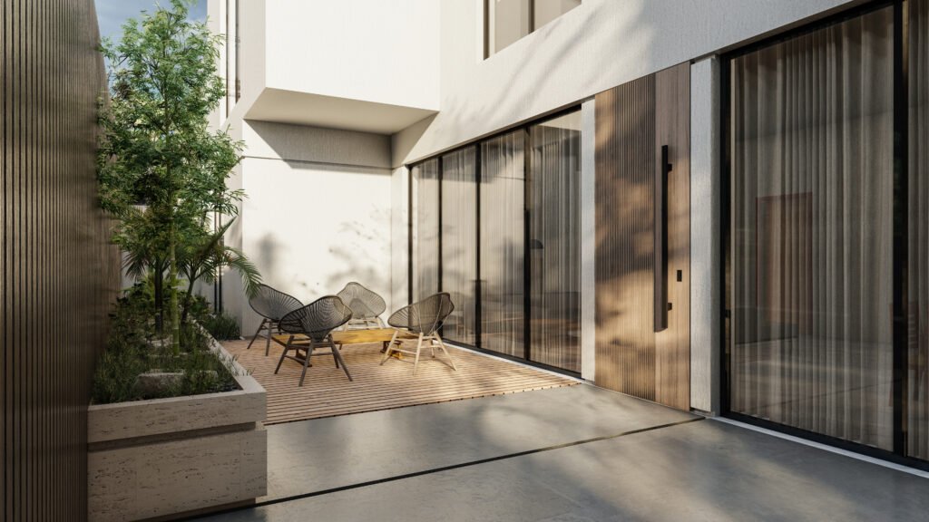 - الربط الداخلي الخارجي: نوافذ زجاجية منزلقة واسعة تفتح مباشرة على الفناء الخارجي لتوسيع مساحة المعيشة.