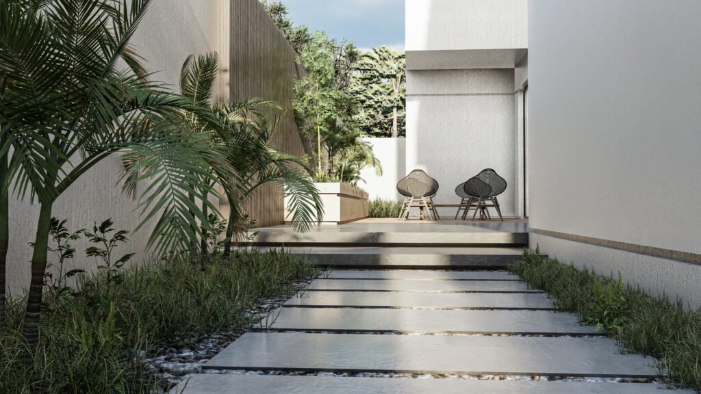 - ممرات اللاندسكيب: استخدام بلاطات حجرية عائمة (Stepping Stones) تتخللها مساحات من الحصى والنباتات لربط المدخل بمناطق الجلوس.