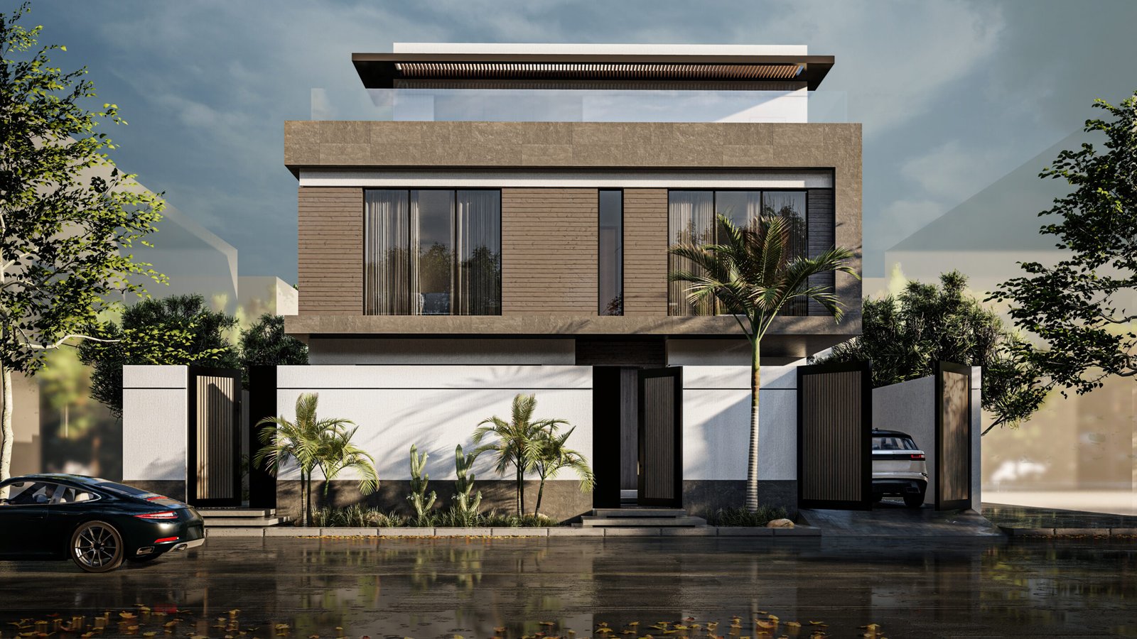 يعتمد هذا المشروع على التوازن المثالي بين الطراز المعماري الحديث واللمسات الطبيعية. يبرز استخدام التكسيات الخشبية كعنصر أساسي في الواجهات العلوية والأسوار المحيطة، مما يضفي هوية بصرية مميزة تكسر حدة المواد الصناعية وتعزز من الإحساس بالراحة النفسية.
